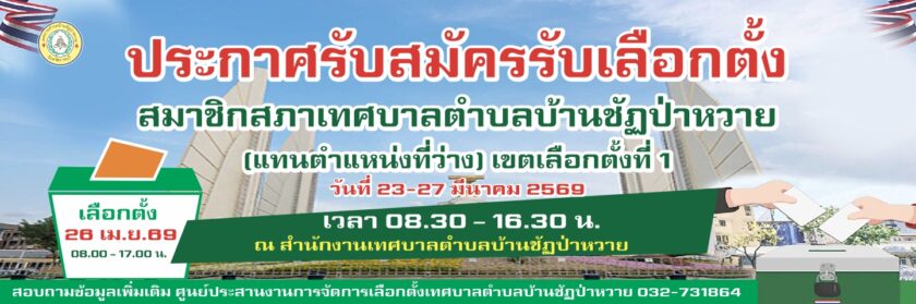 ประกาศรับสมัครรับเลือกตั้งสมาชิกสภาเทศบาลตำบลบ้านชัฏป่าหวาย เขตเลือกตั้งที่ 1 (กรณีแทนตำแหน่งที่ว่าง)